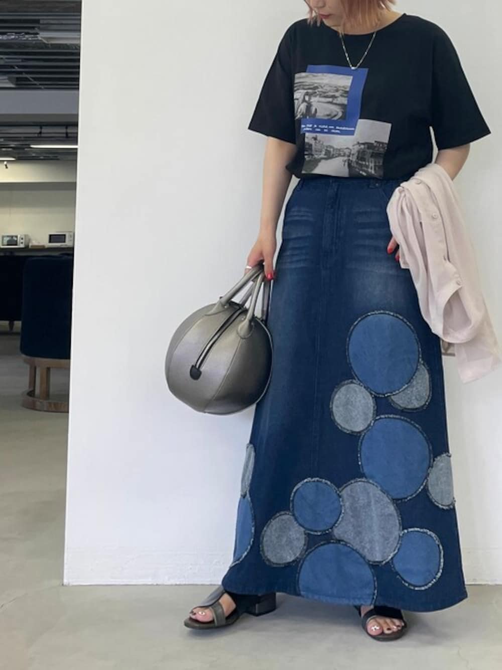 osharewalker staff(osharewalker ZOZO店)のデニムスカート「【廃盤】『ドットパッチワークデニムスカート』」を使ったコーディネート