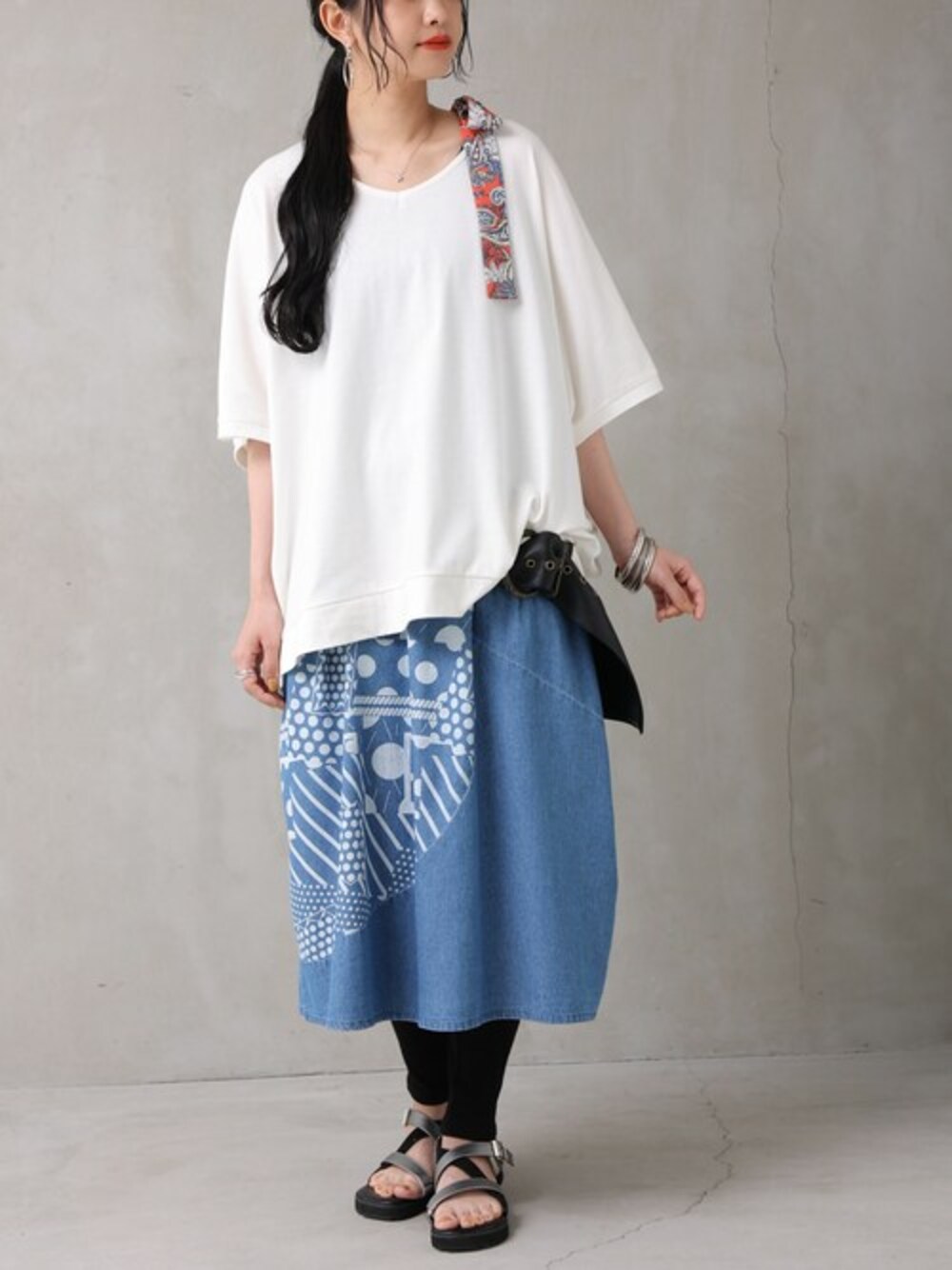 osharewalker staff(osharewalker ZOZO店)のデニムスカート「【廃盤】『抜染プリントデニムコクーンスカート』」を使ったコーディネート