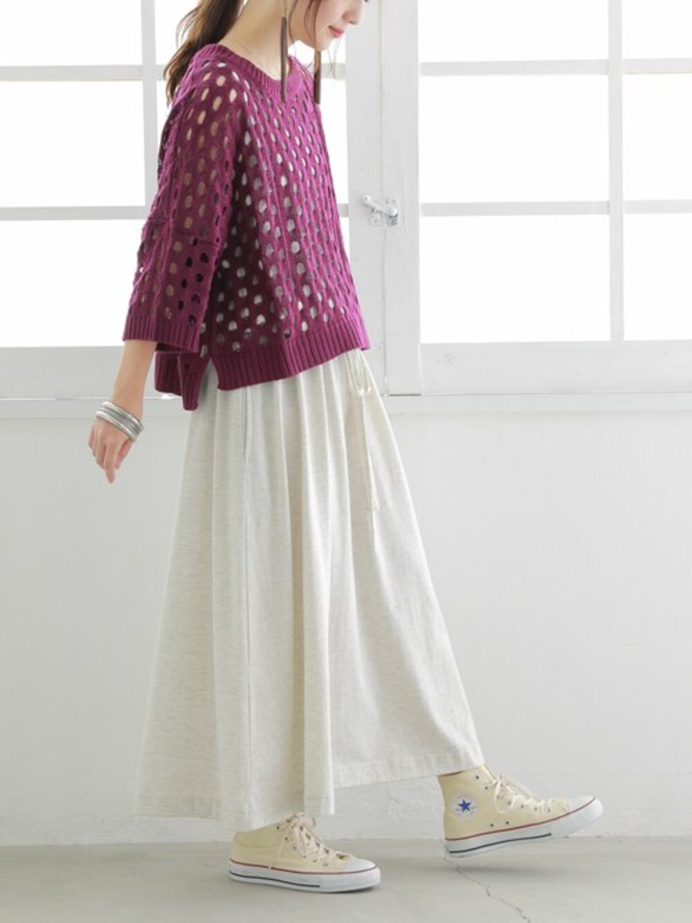 バランスの取りやすいショート丈×ゆったりラフなサイズ感✲ 絶妙な穴あきデザインのニットは重ね着がしやすいシルエットで、 簡単にレイヤードコーデが楽しめます♪
