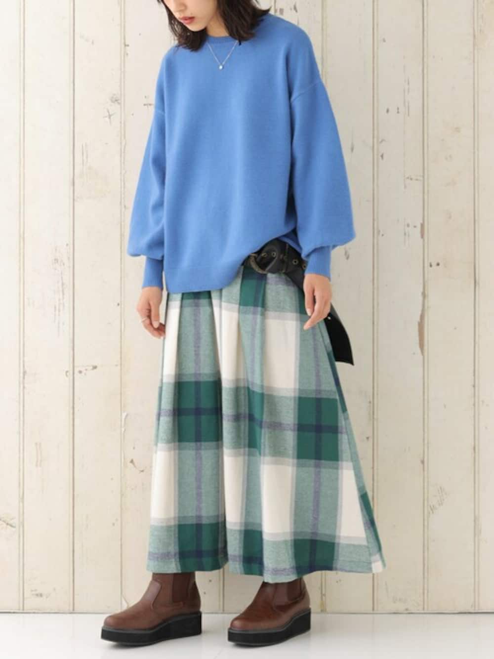 差し色投入でお洒落度上がるニット❁ もっちり柔らかな素材で着心地抜群です。 お家で手軽に洗える素材です♪ 大きめチェック柄のスカートは、 コーデのアクセントにもなるのでおすすめ。 ネルシャツのような程よい起毛感のある綿混素材です。