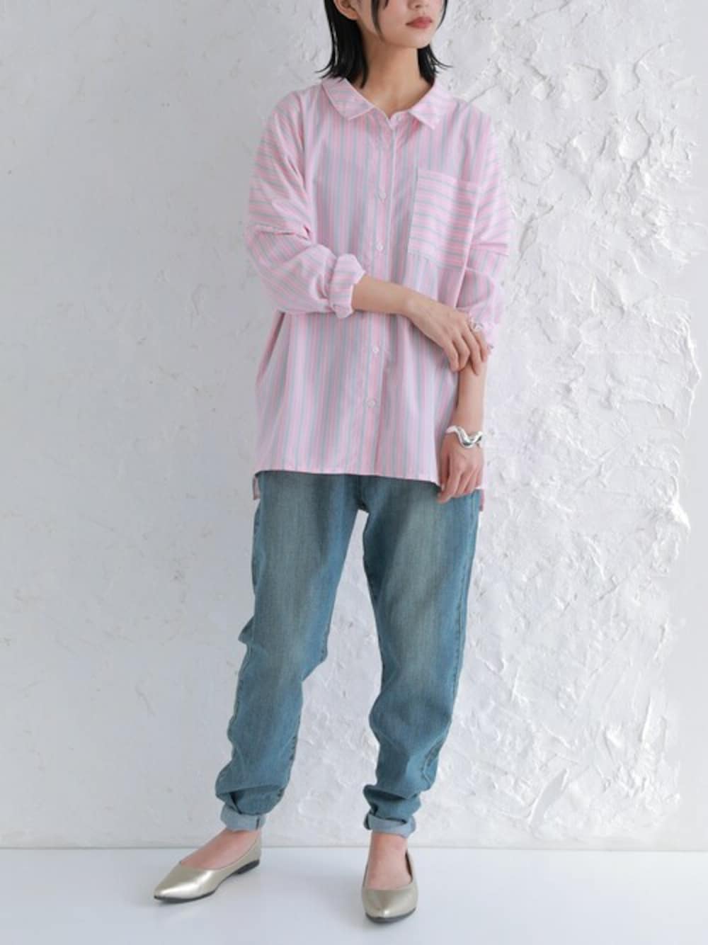 爽やかな配色の3色ストライプ柄が目を惹くシャツ。 一枚でトップスとしてだけでなく、羽織りとしてもおすすめ◎ 前後差のある着丈とサイドスリットで、抜け感を演出。 ボーダー見えする胸ポケットは、お洒落なワンポイントに♪