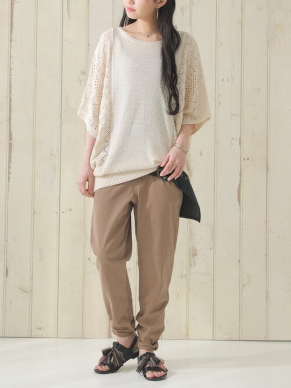 osharewalker staff(osharewalker ZOZO店)のニット/セーター「『ドルマン透かし編み切替サマーニット』」を使ったコーディネート