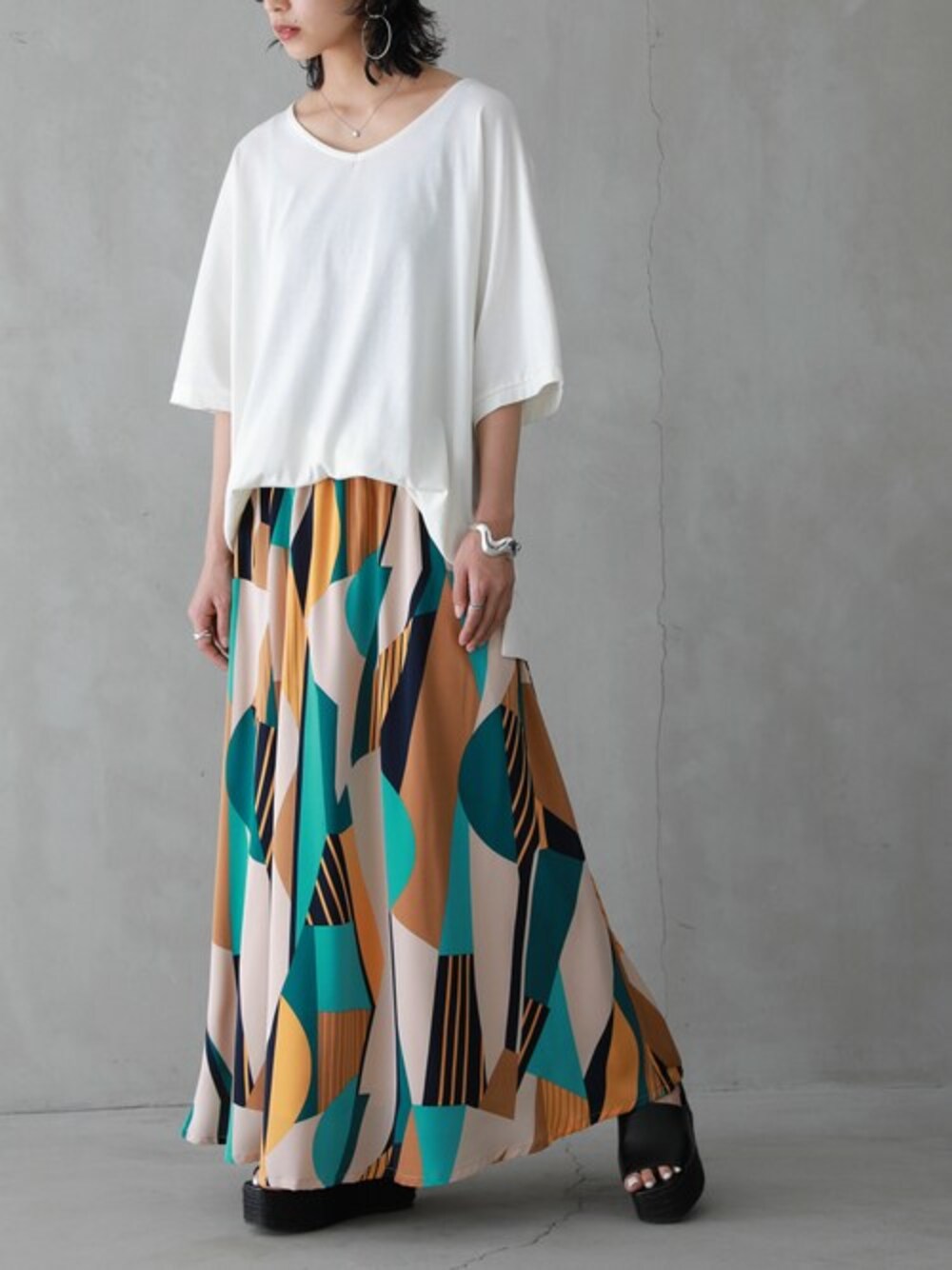 大きめな幾何学柄が印象的で、穿くだけでコーデの主役になるロングスカート。 シンプルなトップスに合わせると一気に華やかな雰囲気に★
