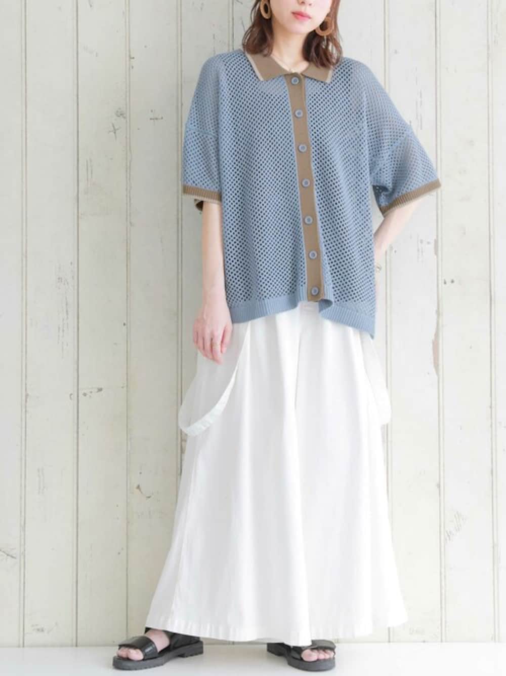 配色×メッシュで、ラフにこなれる。 大きすぎないメッシュ編地で程よい肌見せ。 配色デザインがポイントになり、ボタンを開けてカーデとしても着こなしを楽しめるメッシュ編みニットトップス。 肘上まである袖丈で二の腕カバーを実現。 どんなボトムスにも合わせやすい着丈感で、自分好みのコーデを楽しめる1着。 トップス、カーデどちらでも使うことができ、気分に合わせて着方を選べます。