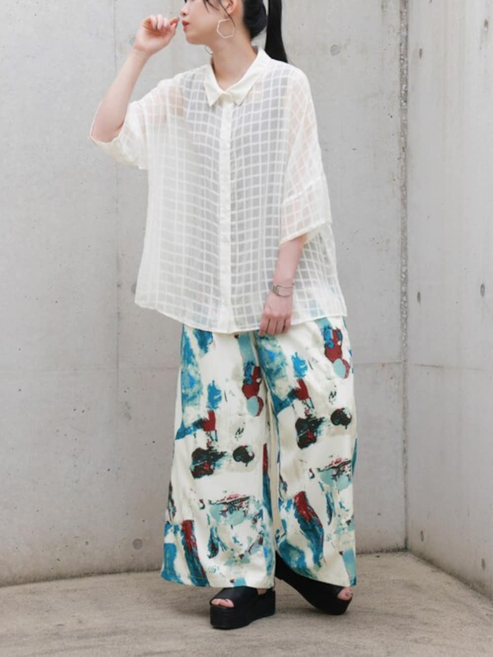 いつもイイね&閲覧ありがとうございます🙇 『ラフさと抜け感を欲張る。』 襟と前立ての無地切り替えがアクセントになったチェック柄のシアーシャツのご紹介です! ラフに着られるゆるっと シルエットと上品な透け感が魅力を惹き立ててくれる。 水彩画のボトムと合わせてモードな仕上がりにしてみました😊✨