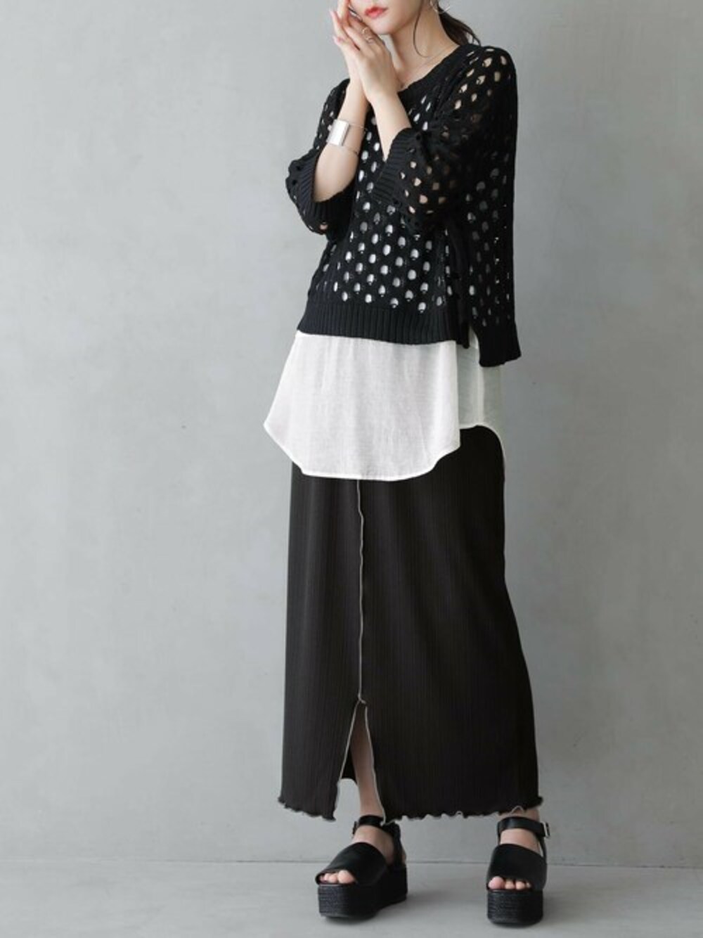 絶妙な穴あきデザインでお洒落に決まる、七分袖ニット♪ バランスの取りやすいショート丈×ゆったりラフなサイズ感で、重ね着がしやすいシルエットに。 前後差のある丈感と裾のスリットで抜け感をプラスします。