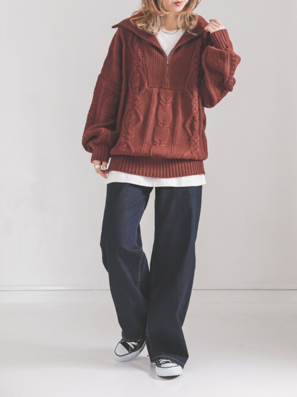 osharewalker staff(osharewalker ZOZO店)のニット/セーター「『ハーフジップデザインケーブルニット』」を使ったコーディネート