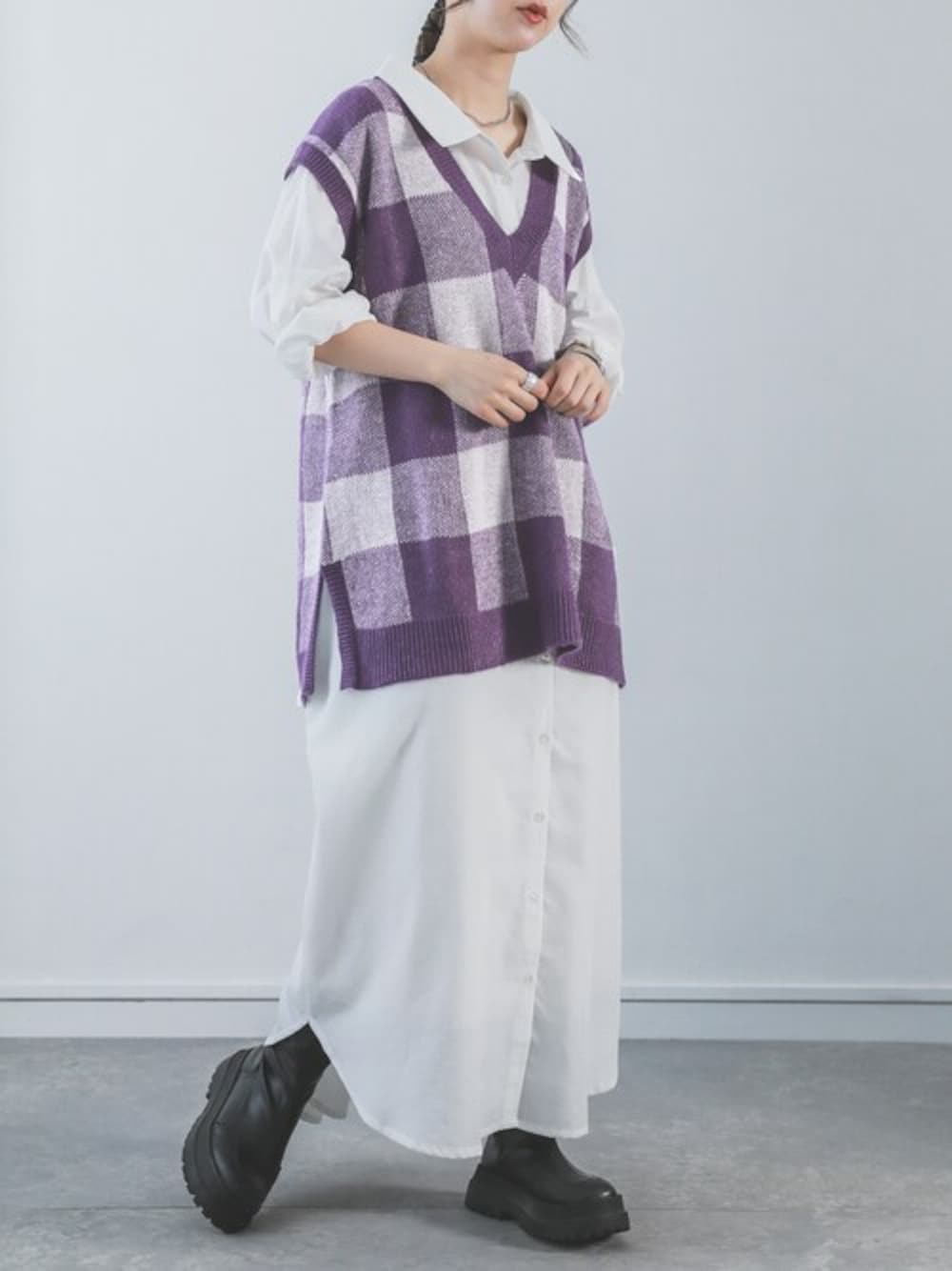 一枚で着ても小物と合わせてもお洒落になるシャツワンピ。 ワンピースとしても羽織としても使えるシンプルさで、コーデの強い味方に。 優しい風合いのニットベストは、大きめのギンガムチェック柄がお洒落に映えます。