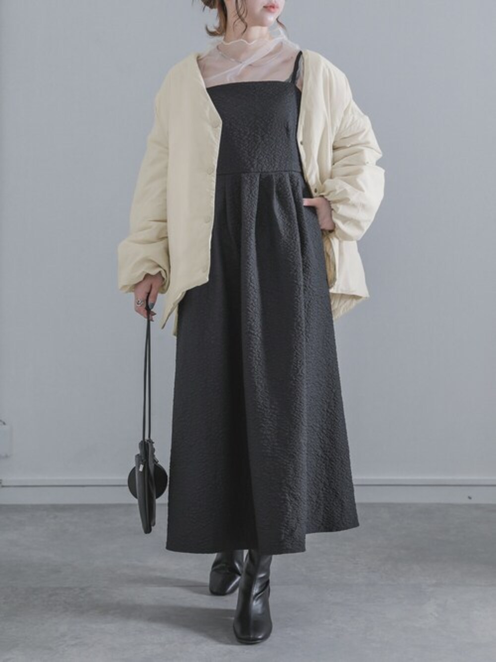 いつもイイね&閲覧ありがとうございます🙇 華奢な肩紐にスッキリした胸元デザインと、ふくれジャガード生地の風合いが目を惹くキャミワンピース。 バックギャザー×リボンデザインで360度お洒落に見せる。 すっきりした胸元デザインに、胸下からはタックデザインでボリューム感のある程よいフレアシルエットです😊✨