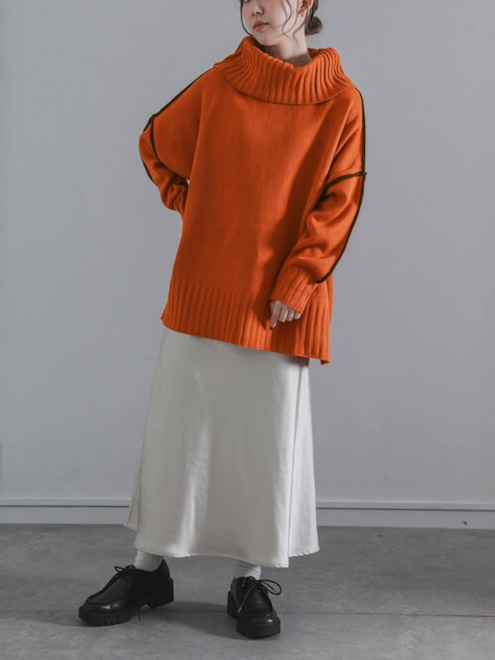 いつもイイね&閲覧ありがとうございます🙇 目を惹くバイカラーデザインがセンスを格上げする、タートルネックニット。 ボリュームのある首もとデザインで小顔効果も◎ 深まる季節だからこそ、明るい色を取り入れて。 オレンジが目を惹くお洒落なニットです✨