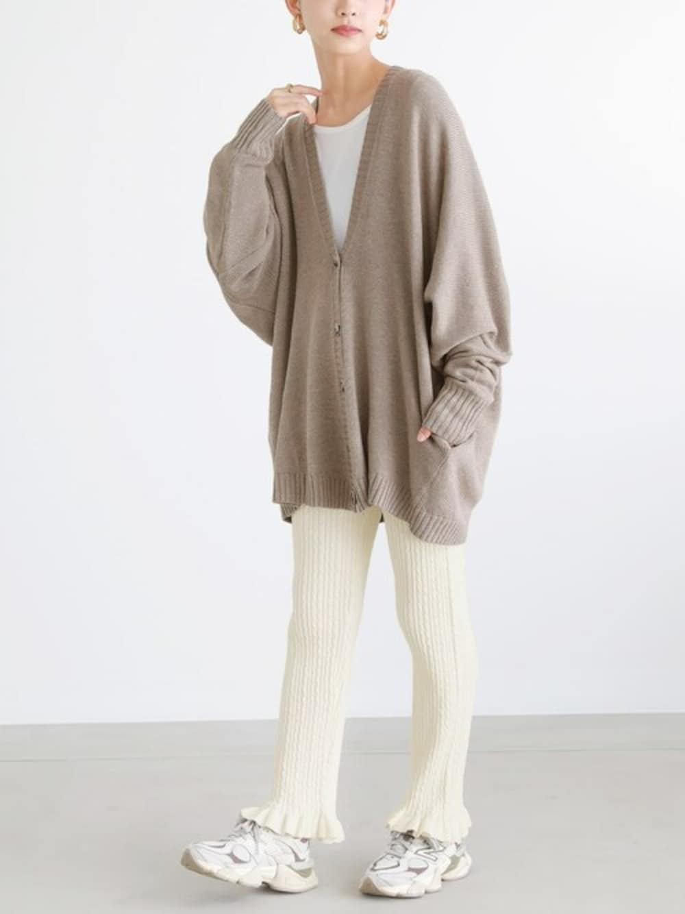着るだけでこなれ感を発揮する、計算されたシルエット。 羽織るだけでコーデが決まるカーディガン。 控えめなケーブル柄で、色んなコーデに合わせやすい。 ぴったりしすぎないストレートシルエットのニットレギパンを合わせました。