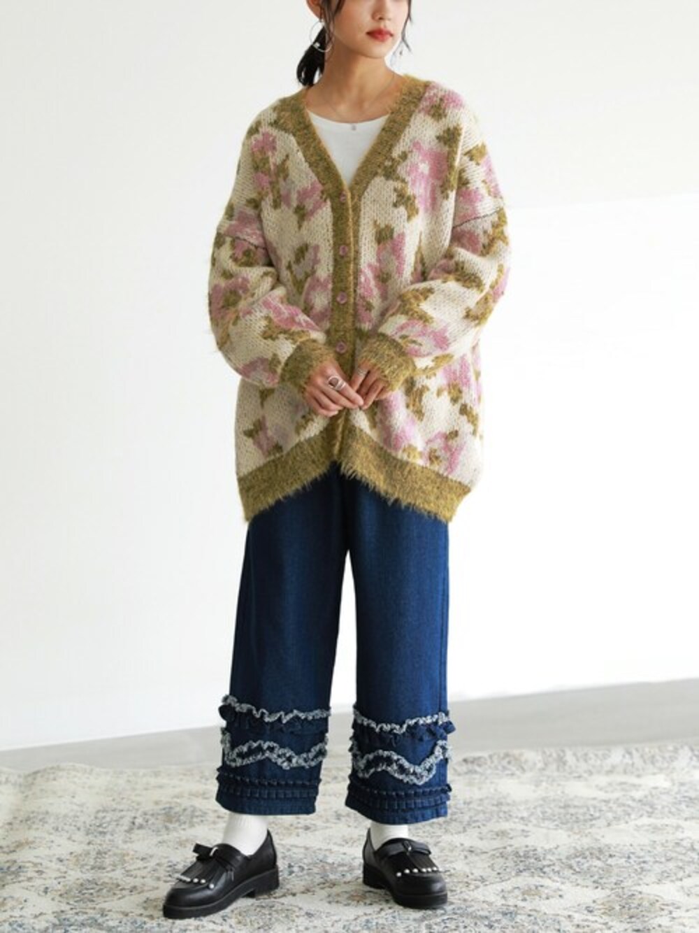 osharewalker staff(osharewalker ZOZO店)のカーディガン/ボレロ「【廃盤】『モヘヤタッチ&シャギー花柄ニットカーディガン』」を使ったコーディネート