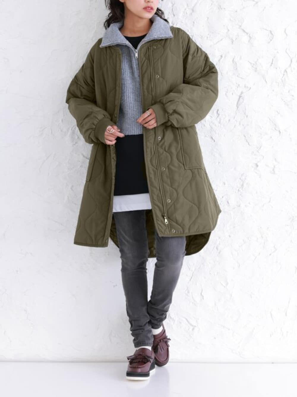 肩落ちシルエットでゆるっとラフに着られる、中綿入りキルティングコート。 スカートにもパンツにも合わせやすく、軽くて気軽に羽織れる一着です。 表地はつるっとしたカジュアルな印象のツイル生地×中綿は着ぶくれしないよう厚みを調整したこだわりの素材。 イージーケアでおうちの洗濯機でも洗えます◎