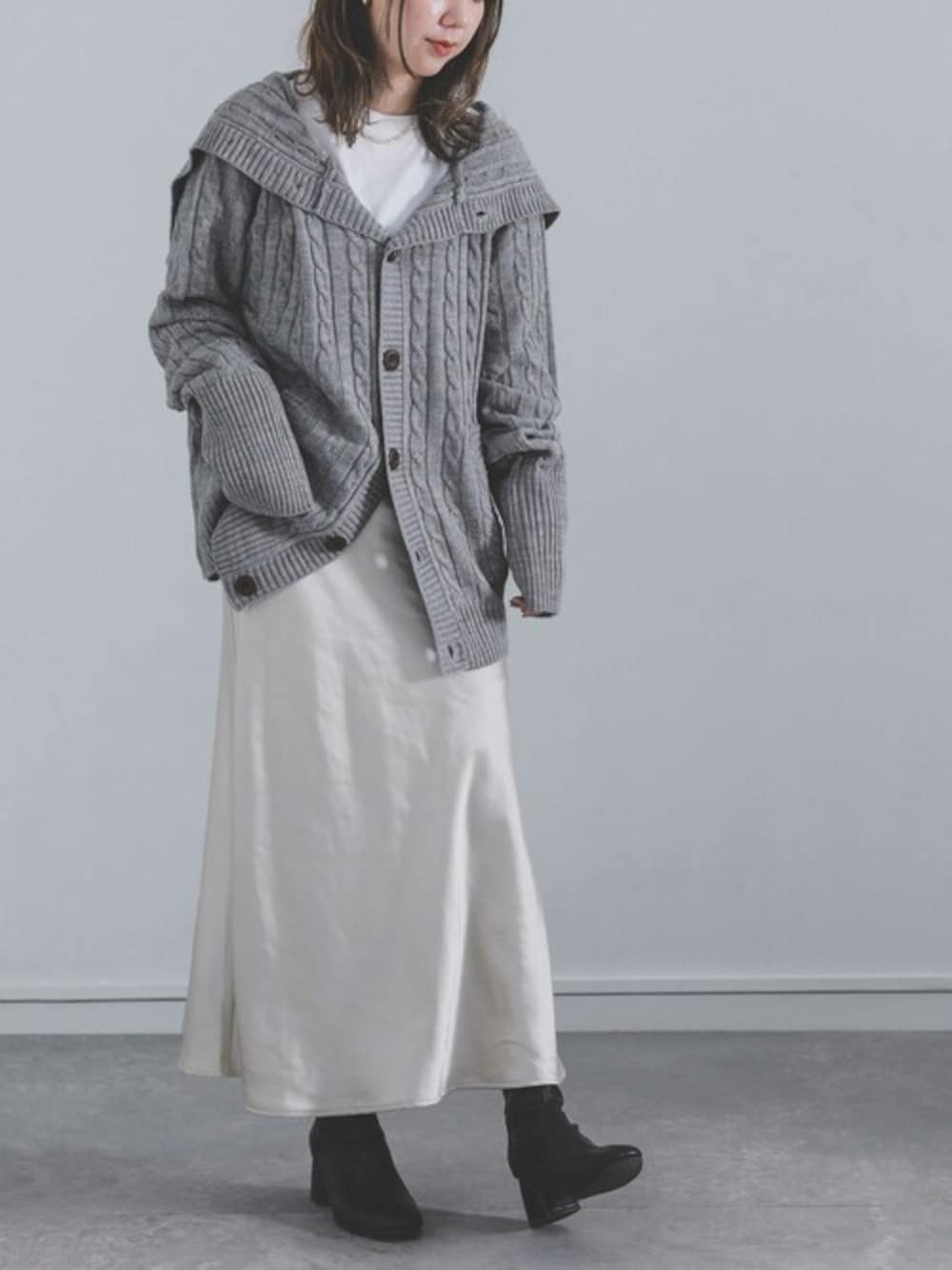 たっぷり長め袖でこなれ感UP。 アレンジで表情が変わる、頼れる着回しニットカーデ。 フードの先端まで連なったボタンの開閉アレンジで、様々な着こなしができる。 パーカーとしてはもちろん、ケープ風やスタンドカラーにも。 その日の気分に合わせて、お好みのアレンジで印象を変えてコーデを楽しめます。 くしゅっとなるよう、長めにデザインされた絶妙の袖丈は、折り返しても◎