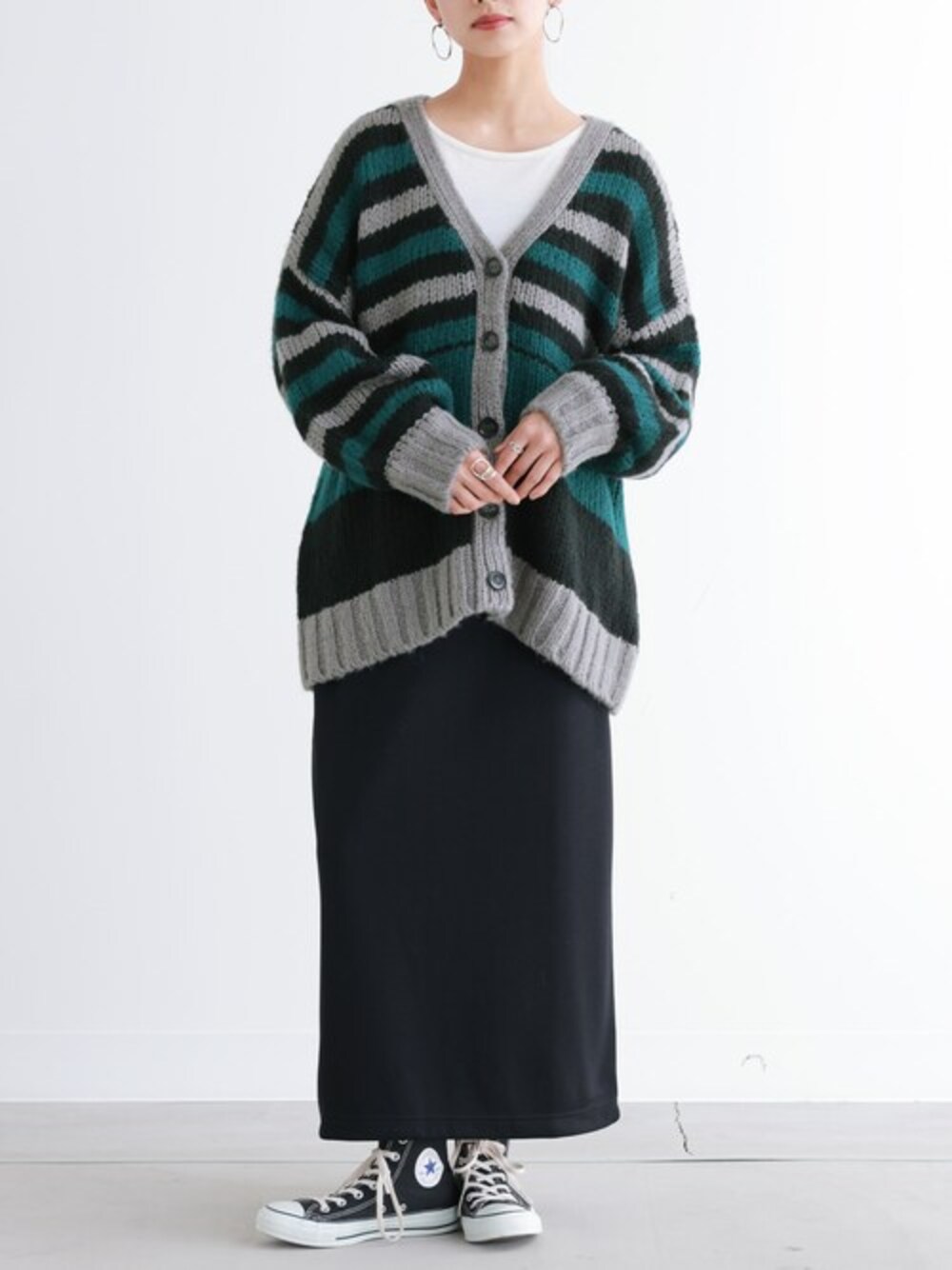 osharewalker staff(osharewalker ZOZO店)のカーディガン/ボレロ「『ミックスボーダー柄ニットカーディガン』」を使ったコーディネート