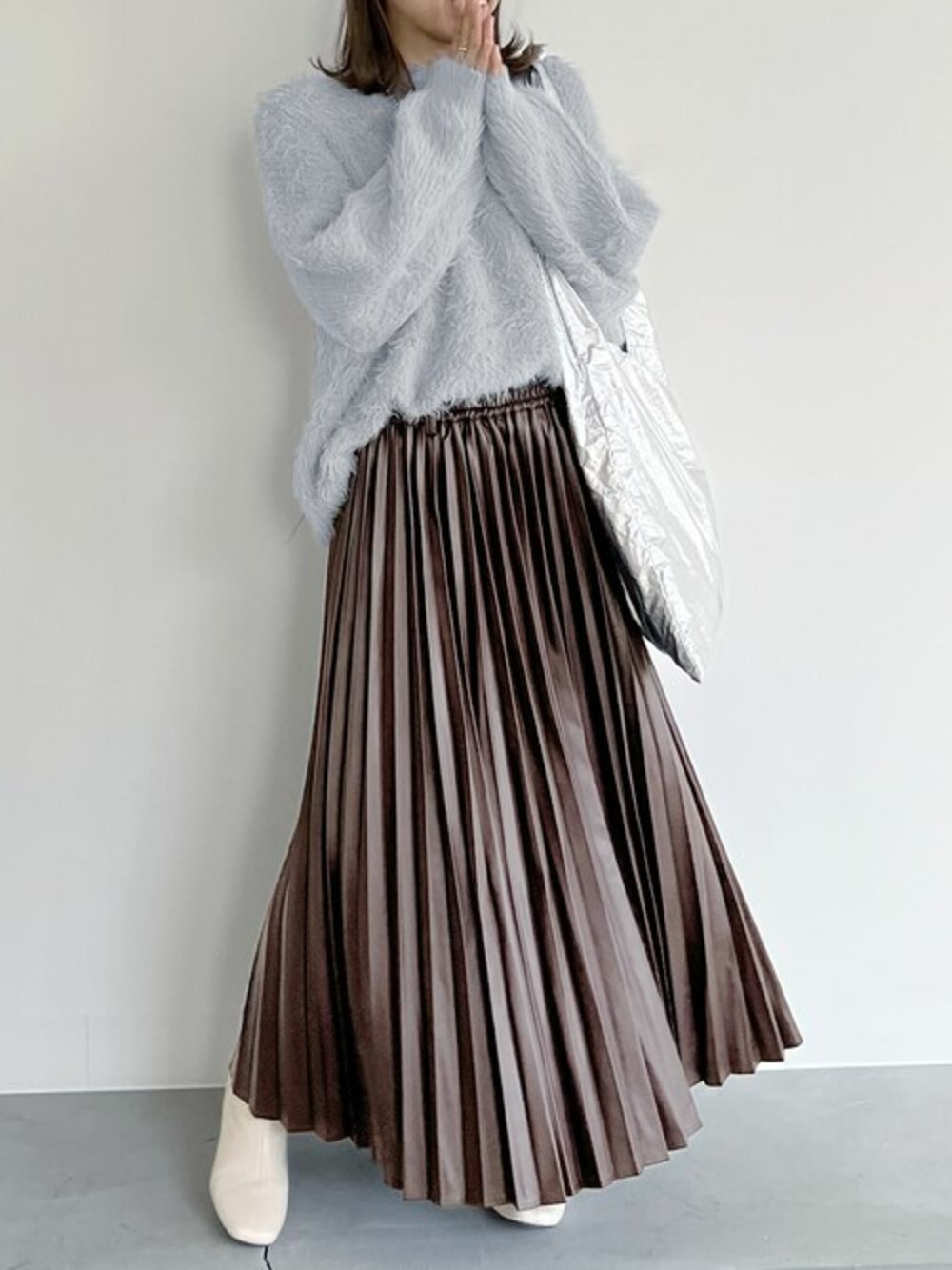 フェイクレザー×アコーディオンプリーツのデザイン性。 こなれたスタイリングになるロングスカート。 シャギーニットと合わせて甘辛ミックスコーデに❁