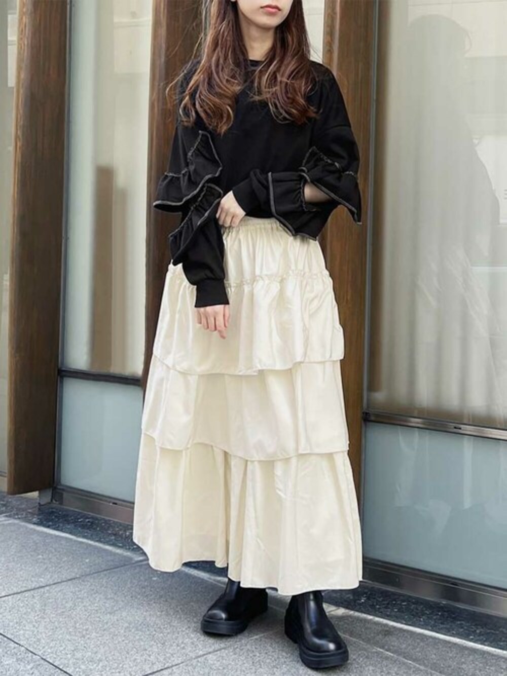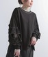 袖の2段フリルが目を惹く、スウェットトップス。 さりげないスラッシュ開きで程よい肌見せも叶う。 襟ぐりとフリルの端にあしらったステッチもアクセントに。 ロングシーズン着用ができる程よい厚みの生地感です。