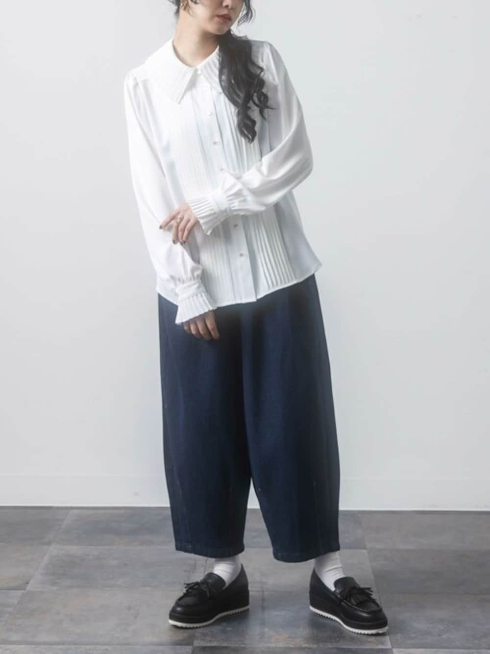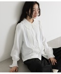 襟・袖口に施した細かいプリーツと、前身頃のピンタックがポイントになったブラウス。 カーブ&着丈差をつけた裾で、トップスをアウトにしても使いやすいデザインです。 ニットやカーディガン、ジャンスカなどと合わせ、プリーツ部分を見せるスタイリングもおすすめ◎