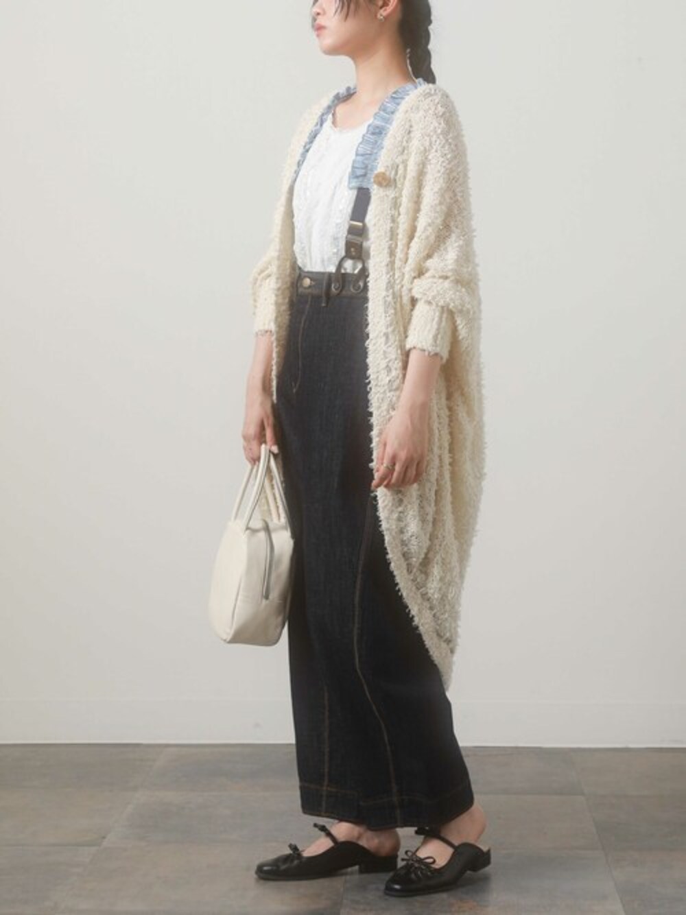 ゆるっとしたモモンガシルエットのカーディガン。 配色に染めたコットンレーステープを使用した、襟ぐり・前立て・裾の手縫いステッチがポイント。 カーブしたシルエットの前立てはワンピースやスカートとも合わせやすく、後ろはロング丈で気になるお尻周りもしっかりカバーしてくれます。
