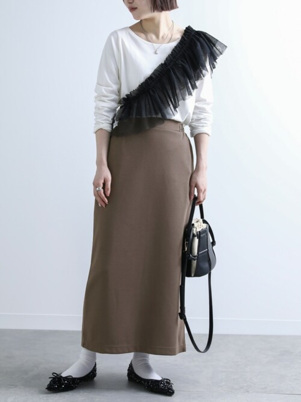 絶妙なストレートシルエットでスタイルアップするロングスカート。 程よく厚みのあるポンチ素材は、カットソー生地だから伸縮性があり穿き心地も抜群。 ロングシーズンで活躍する優秀素材です。