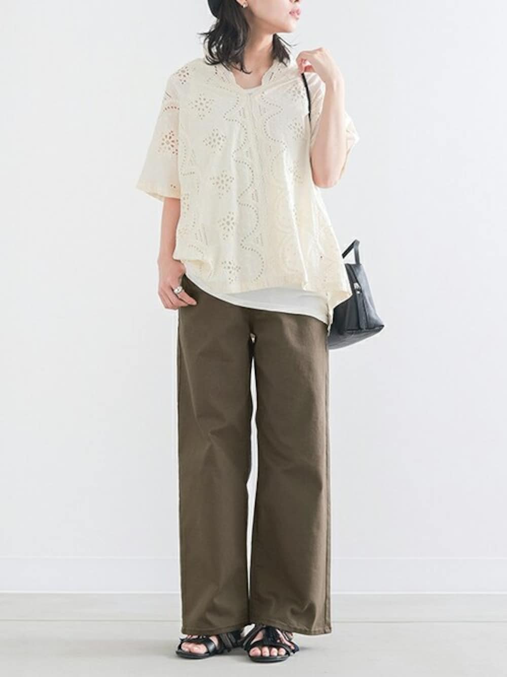 理想のストレートワイドパンツ。 Tシャツはもちろん、ワンピースやチュニック、アウターなどのコーデに取り入れやすく、デイリー使いにぴったり。 ウエストインをしてもお洒落に決まる一着です。