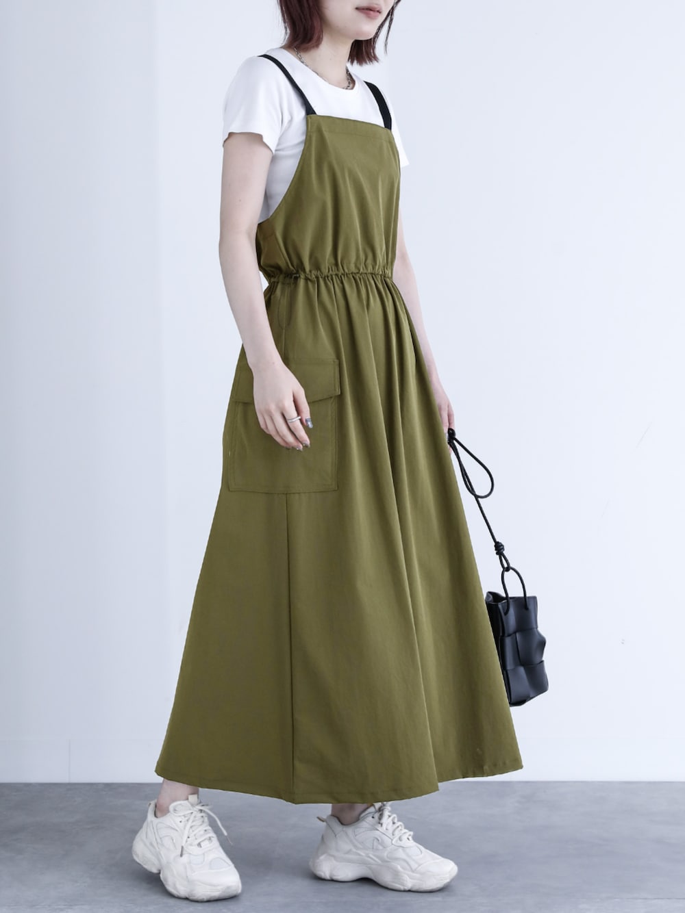 撥水機能付きの生地を使用したジャンパースカート。 脇のカーゴポケットがポイントになったデザイン。 ウエストは絞ってギャザー分量を調節できます。