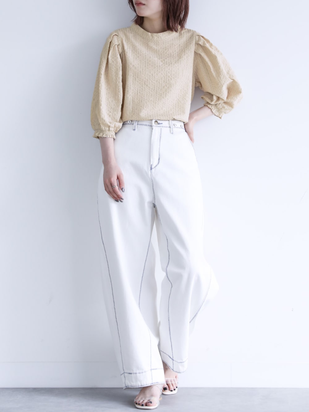 シボ感のあるサッカー素材が大人のこなれ感を演出。爽やかなストライプ柄が映える一枚です。 2サイズ展開のすっきり見えするシルエットで、1枚でもレイヤードしてもご着用いただけます。サロペットなどに合わせてもストライプ柄がポイントになった着こなしに◎