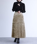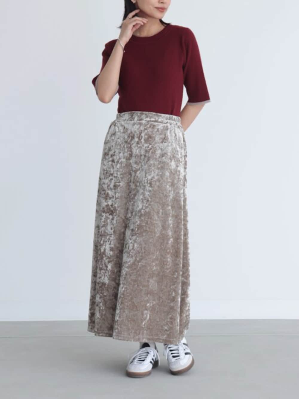 袖口と裾の配色ラインがアクセントになったリブニットは 季節の変わり目にも使いやすいアイテム◎ 大人っぽい雰囲気のクラッシュベロアスカートを合わせて、秋の先取りコーデに。