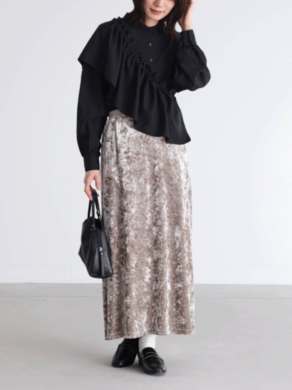上品さと光沢感が大人っぽい雰囲気のクラッシュベロアスカート。 すっきりとした見た目ながら、ウエストにはゴム入りでストレスフリーな穿き心地です。 ブラウスは取り外し可能なフリルケープ付き。 たすき掛けやつけ襟で着回しを楽しめます◎