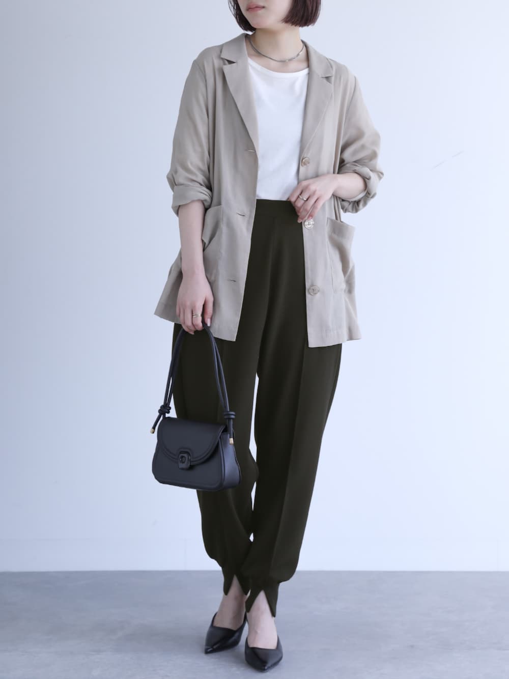 大人の抜け感を惹き出すジョガーパンツ。 細やかなシボ感のあるさらりとしたカットジョーゼット生地を使用。 伸縮性のある生地感で楽な穿き心地&シワにもなりにくいからお手入れも簡単!
