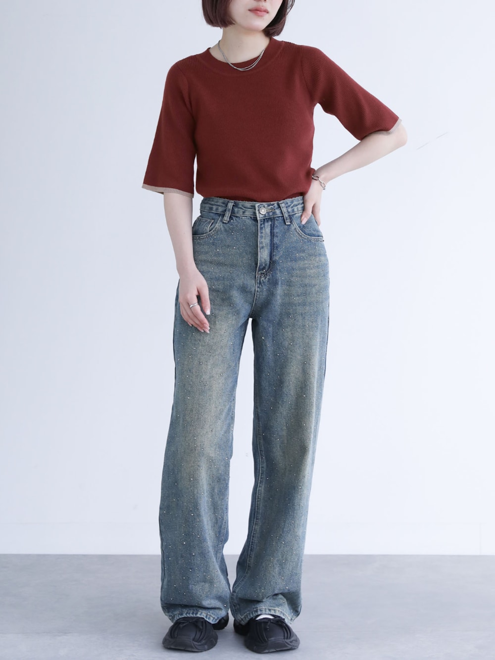 osharewalker staff(osharewalker ZOZO店)のニット/セーター「『配色ライン5分袖リブニット』」を使ったコーディネート