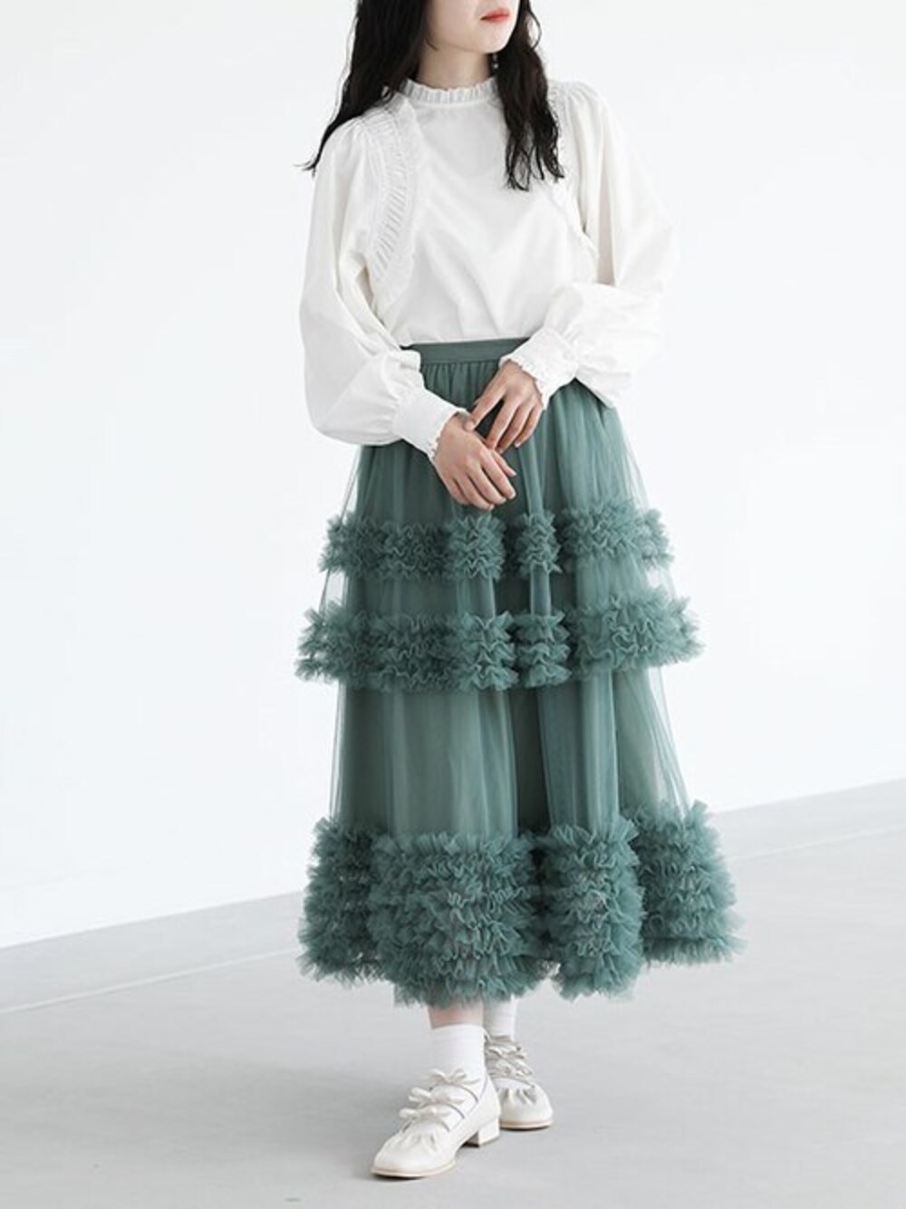 細かなフリルをティアードにして、もこもことしたボリューム感のあるデザインのチュールスカート。 ペチとセットでチュールスカートとしてはもちろん、チュールスカートのみをデニムパンツなどとレイヤードする着こなしもおすすめです。