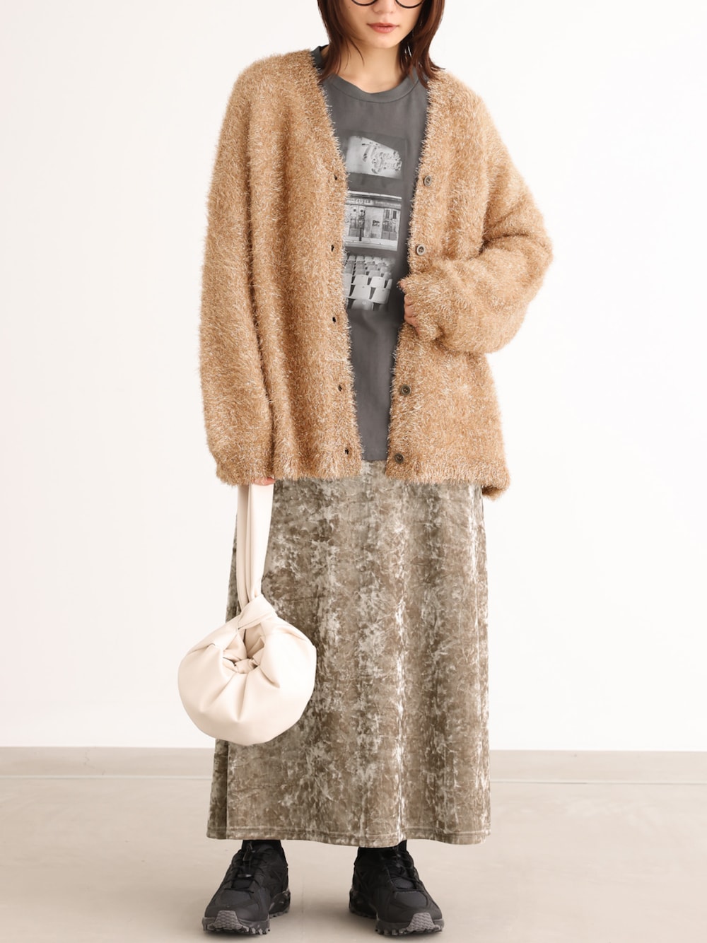 キラキラとしたラメシャギーの糸を使用したニットカーディガン。 金属調のボタンが差をつけるアクセントになります。ゆるっとラフに着られるシルエットも嬉しいポイント。