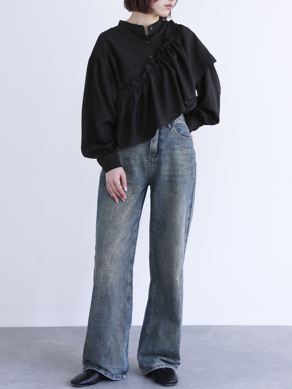 たすき掛けのフリルケープが付いたブラウス。 フリルケープは取り外し可能で、つけ襟としてもお使いいただけます。 すっきり見えするバンドカラーでフリルの甘さと好バランスの一枚。 ケープの端はピコカット始末にして軽さを出しました。