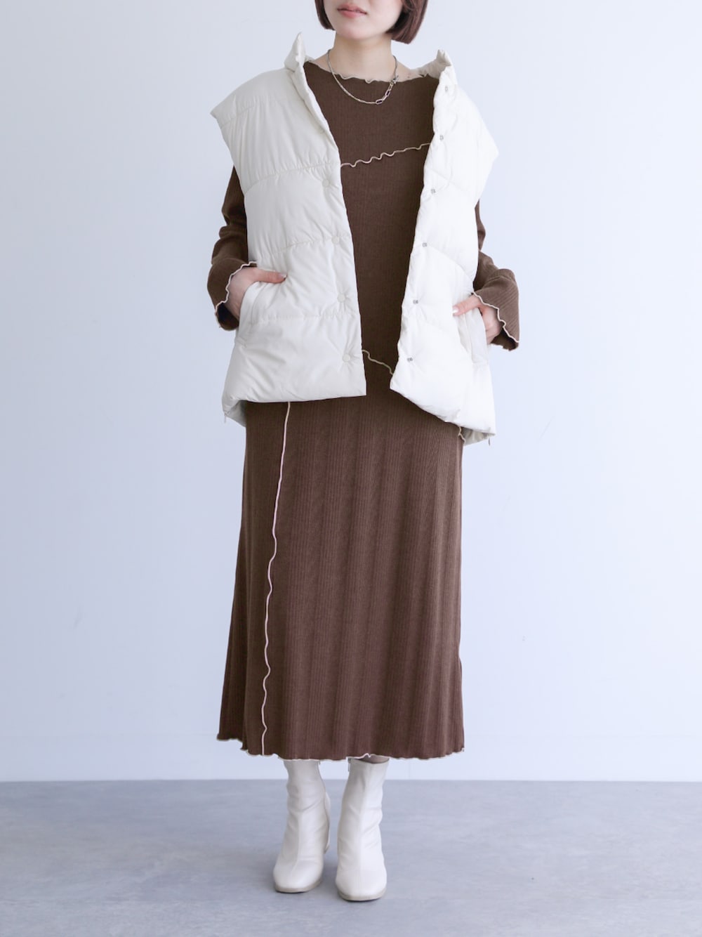 伸縮性のあるランダムリブカットソー生地の配色メローワンピース。 着脱もしやすく快適な着心地です。