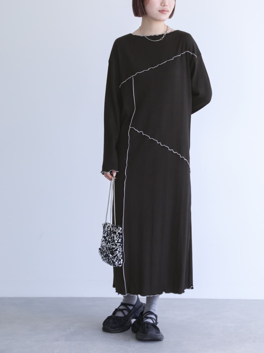 アシンメトリーに入った配色メローがポイントのワンピース。身体のラインを拾いすぎない、程良いサイズ感です。 一枚で着用はもちろん、上にトップスを合わせたり裾からパンツを覗かせたりレイヤードスタイルもお楽しみいただけるワンピースです。