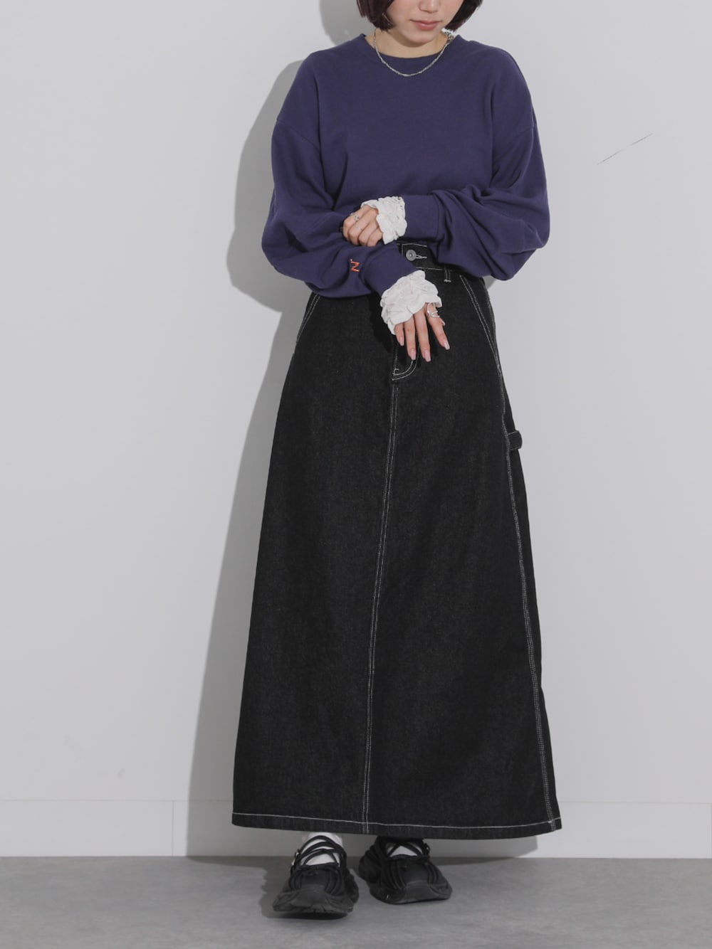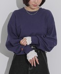 変形した立体のボリューム袖が、着るだけでこなれて見せるスウェット。 右側の袖にラメ刺繍のロゴをあしらい、ワンポイントにしました。 袖にボリュームがある分着丈を短くし、コーデもバランス良く決まります。