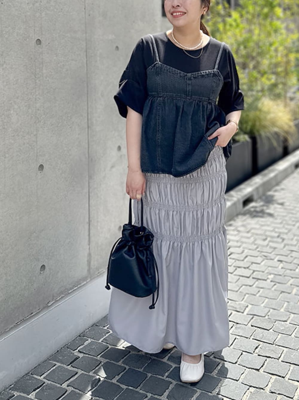 osharewalker staff(osharewalker ZOZO店)のスカート「『裏地付き シャーリングデザインスカート』」を使ったコーディネート