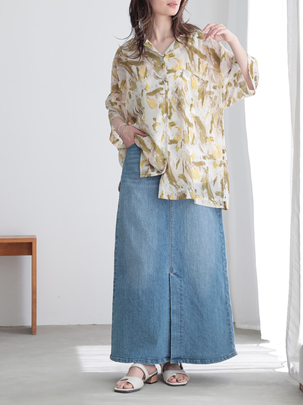 ニュアンス柄とシアー素材が涼しげな印象を叶えるデザインプリントシャツ。 程よいゆるっとシルエットで、 暑い季節も爽やか&ラフにお洒落を楽しめます♡