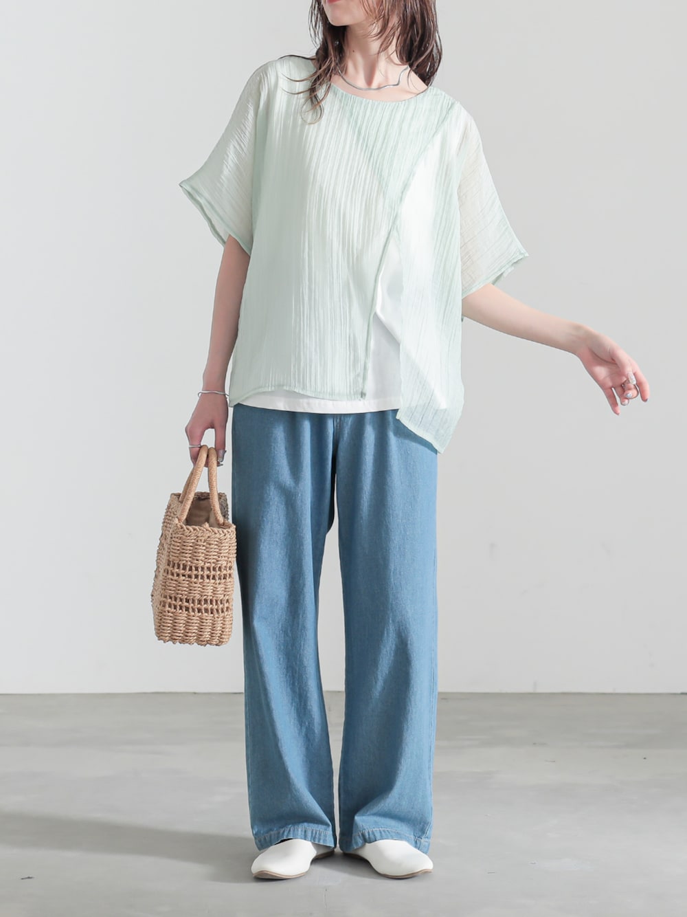 前身頃はシアー生地をクロスしたV字デザインで 抜け感のある涼しげな印象に仕立ててくれます。 トップスをインしてメリハリのある着こなしもおすすめです◎