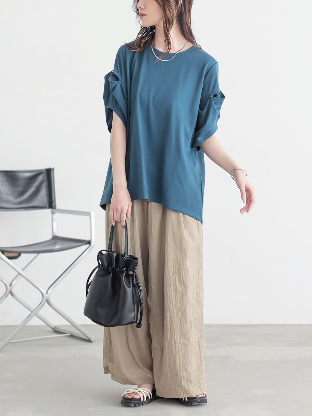 スラッシュあきにタックを組み合わせた大人の印象漂うドレープカットソー。 サロペットやジャンパースカートのインナーでもごわつかないサイズ感です☺