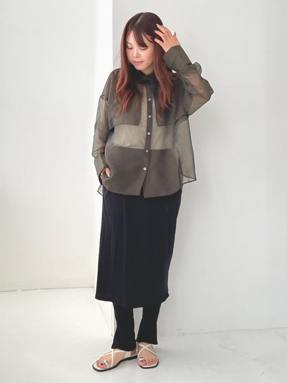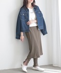 レギンスにスカートがドッキングされた、 1枚でレイヤードスタイルが完成する優秀レギンス。 トップスは、シアーシャツを合わせて こなれ感あるおしゃれ印象に。