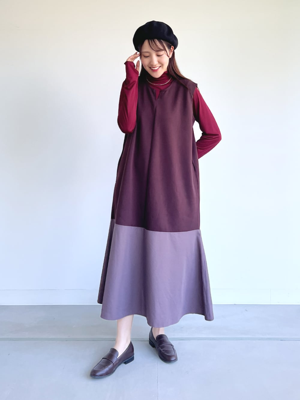 まだまだ暑さが残るのですが 秋のオシャレを取り入れたくて 秋カラーのブラウンとボルドーを合わせたコーデに! ワンピースのインナーには、シアーのロンTを合わせました! 暑い今の時期からも合わせやすく、 これからの季節に大活躍間違いなしです!