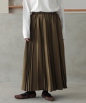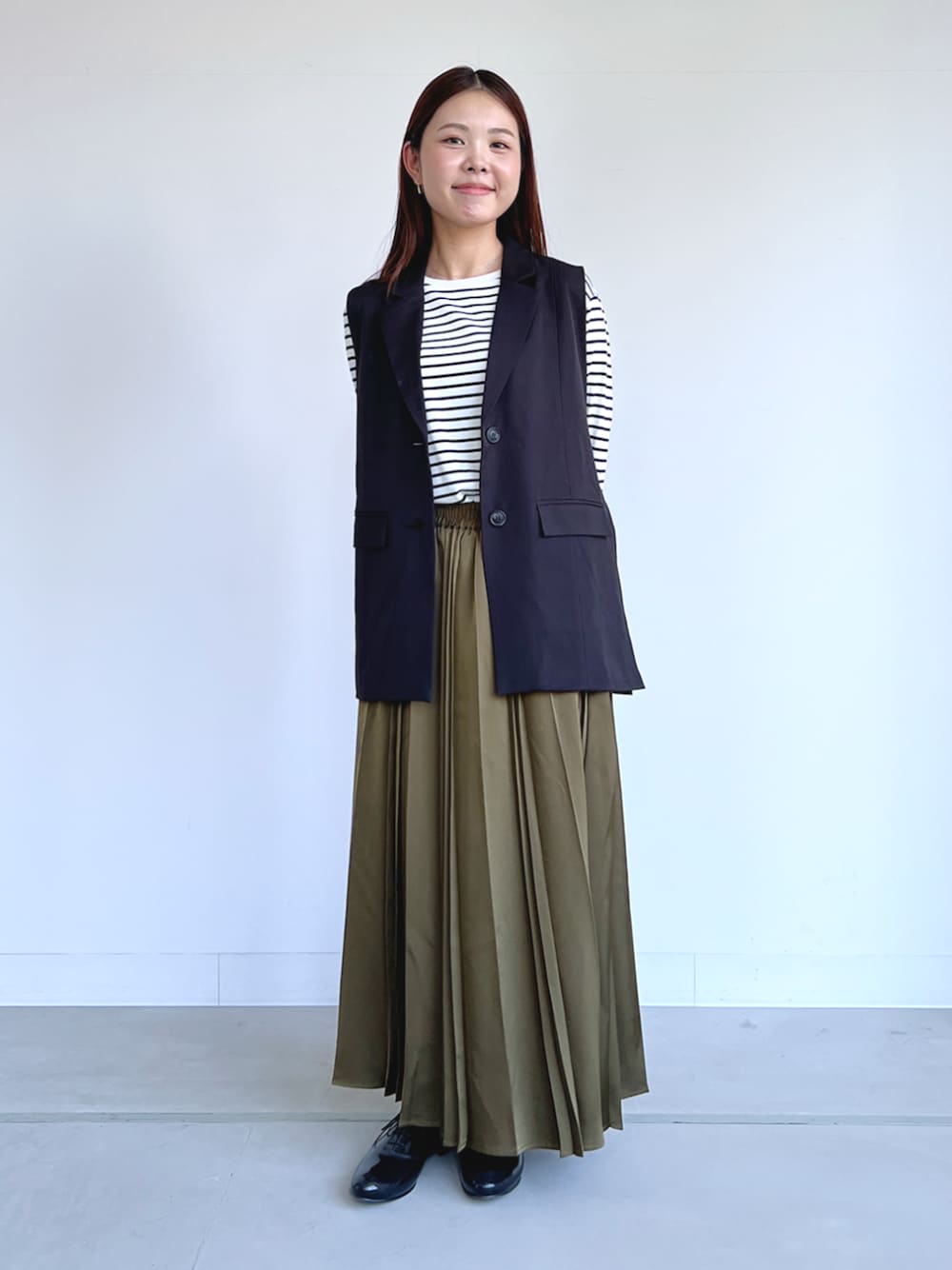 ボーダートップスにベストをレイヤード。 光沢感のあるカーキのプリーツスカートを合わせて 秋の大人カジュアルコーデの完成!
