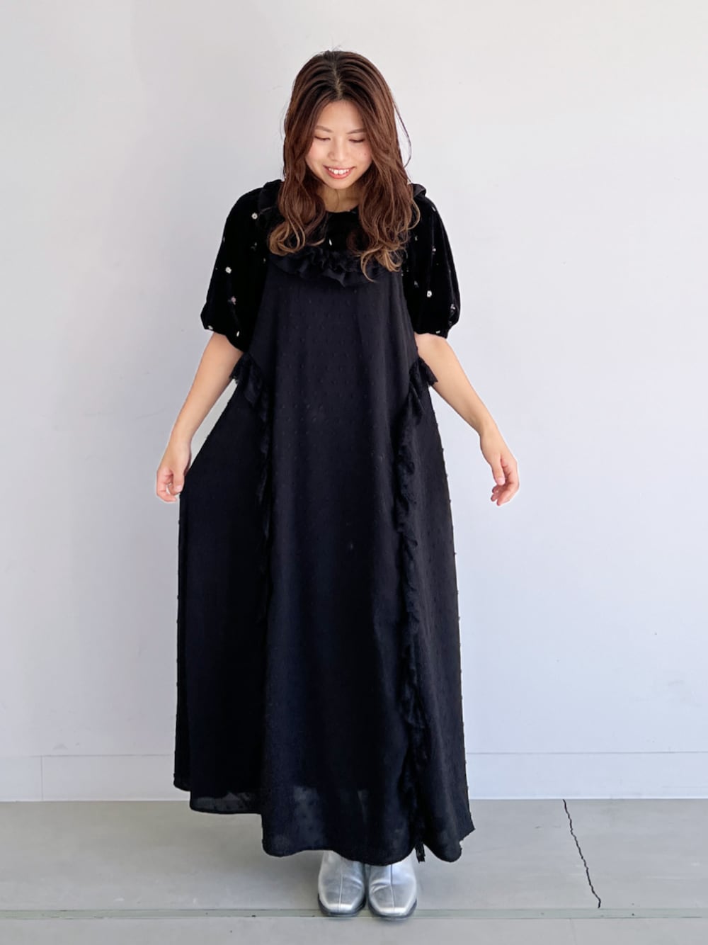 ドビードット生地とレースフリルテープを 使用した贅沢なキャミワンピースを主役にコーデしました! ベロア生地のトップスを合わせて秋らしい印象に♪