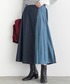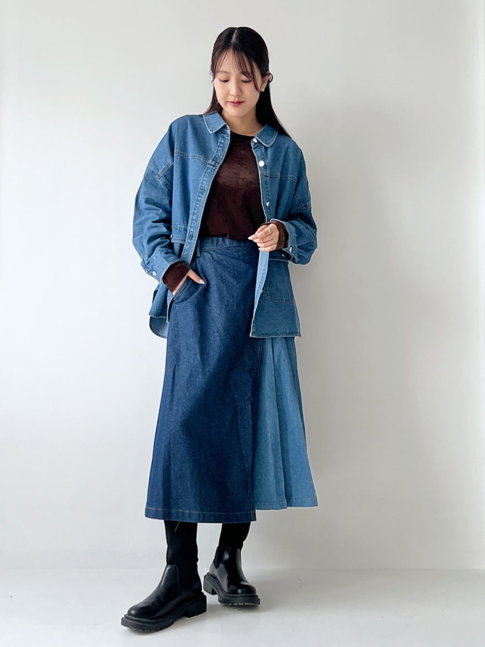 デニムシャツにデニムのスカートを合わせた デニムオンデニムのスタイリングに。 インナーには、ベロア生地のトップスを合わせて 秋らしいスタイリングに仕上げました!