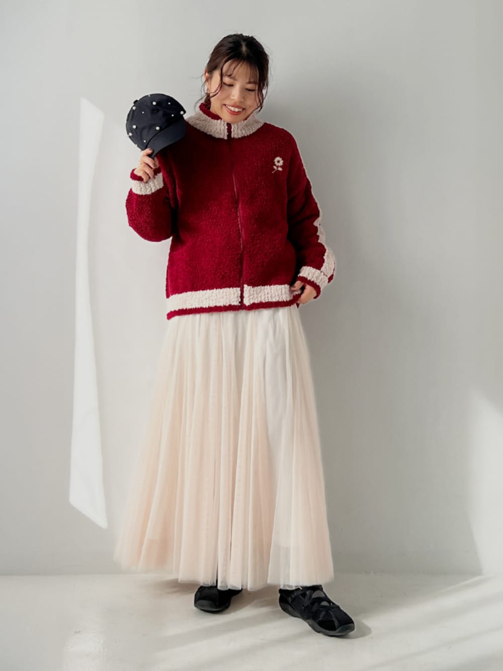 ふわふわのチュールスカートを、 甘くガーリーになりすぎないように トラックジャケットと合わせてコーデしました✨ トラックジャケットのモコモコした素材感ろ合わせて 女性らしくスポーティーな印象にしました!