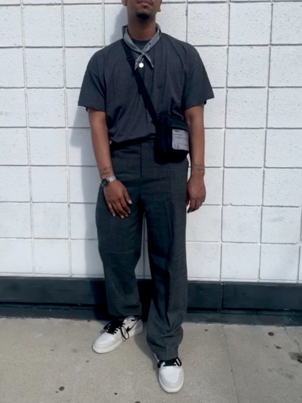 グレー系のスラックスを着用したメンズの春コーディネートの1枚目の写真