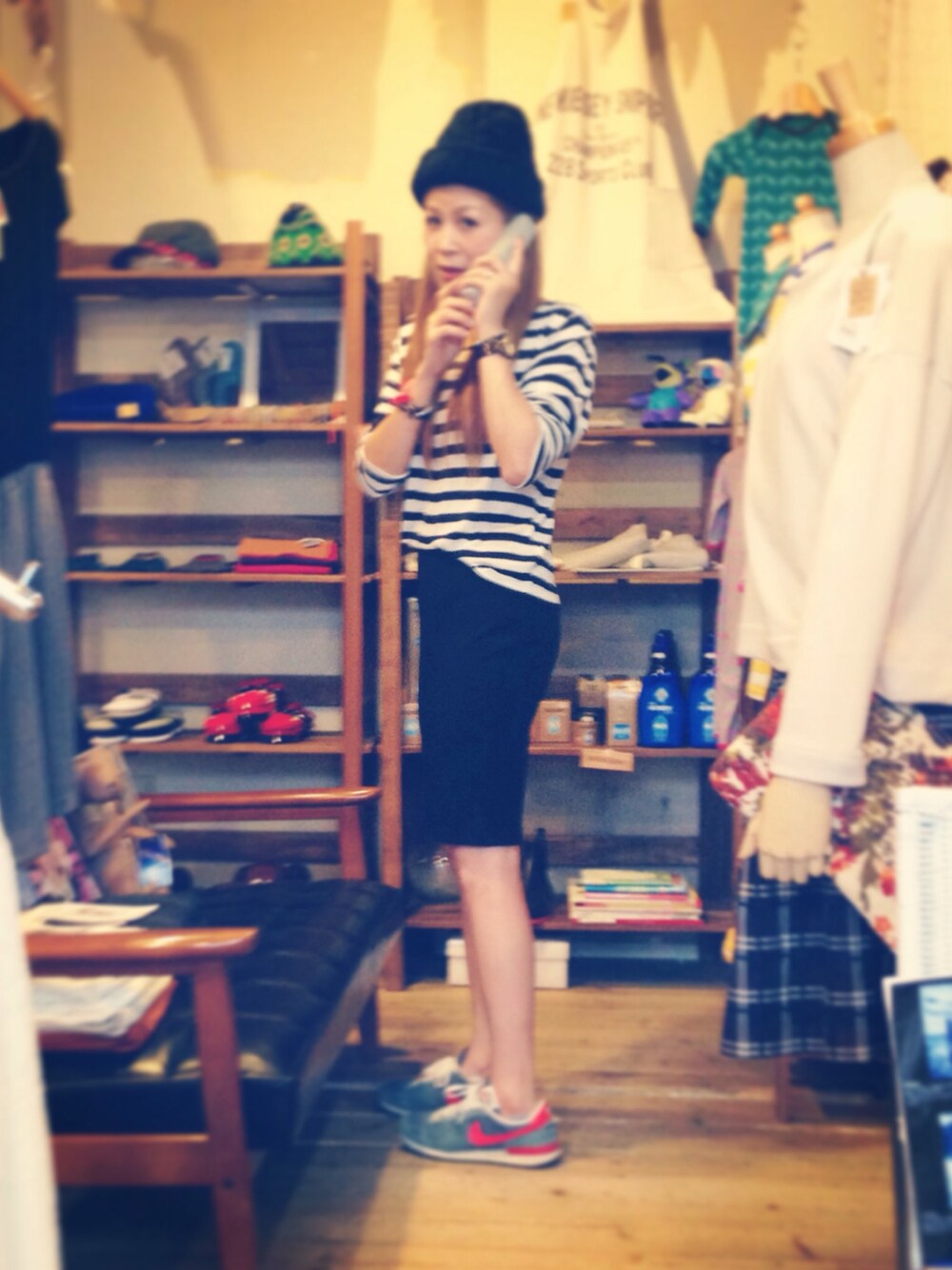 マイティスタッフ 今日の栄子さん! 今日は黒のタイトスカートにボーダーT、 ニット帽にスニーカーでした(^-^)/ お客様と電話されてます(^-^)/