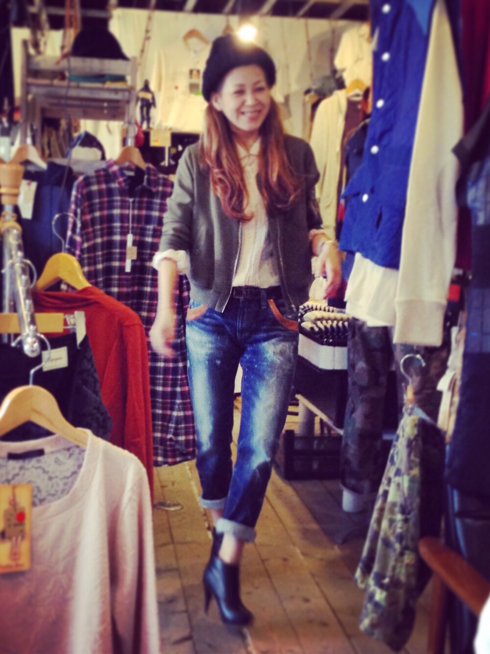 マイティスタッフ 今日の栄子さん! ジーンズにミリタリージャケット、ニット帽にブーティのカジュアルスタイルでした(^-^)/ 今日も楽しそうに仕事してました(^-^)/